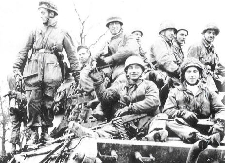 After house to house combat in Weichsal, September 27, 1944, these troops displace. you will notice the soldat on the right carries a G43 with battle sights set and the safety in the '"on" position. photo courtesy of Doug Eberle